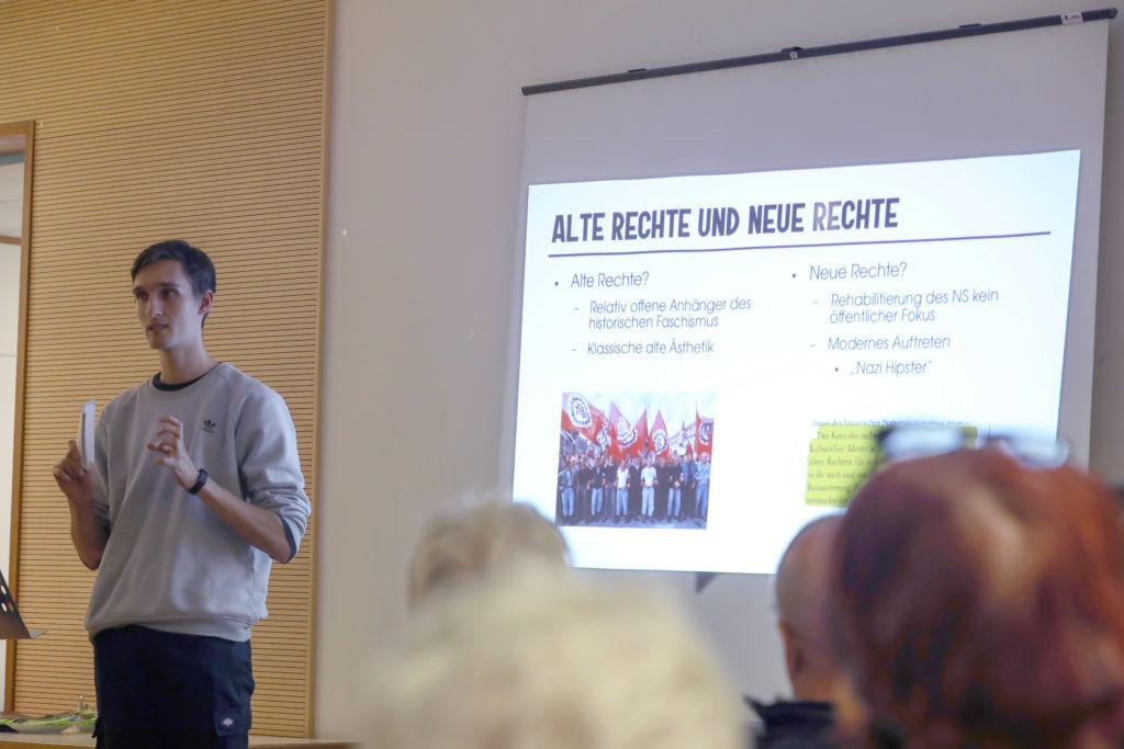 Der Sozialwissenschaftler und Journalist Jakob Helfrich vom Medienprojekt „Jugendinfo“ berichtete über Ziele, Strategien und Auftreten der “Neuen Rechten”, die sich von früheren Bewegungen bewusst absetzen. Vor voll besetzten Reihen erklärte er, wie ständige Wiederholung inakzeptabler Themen die “Grenzen des Sagbaren” erweitern, wobei Medien und Politiker teils gezielt, teils unbeabsichtigt, durch Aufgreifen und Skandalisieren zur Gewöhnung beitragen.